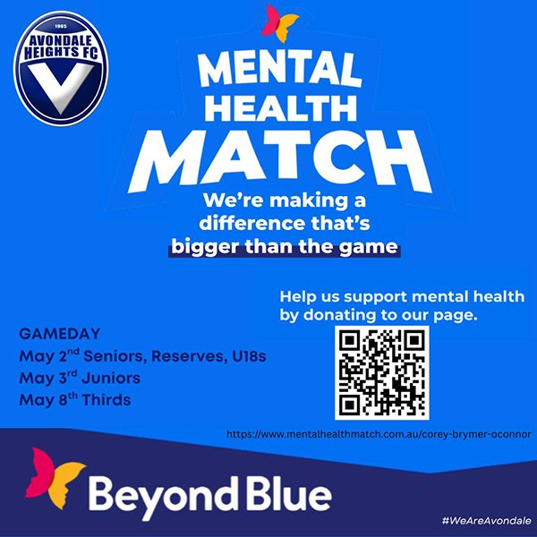 We will be raising funds and awareness for Mental Health with Beyond Blue in the Mental Health Match initiative.