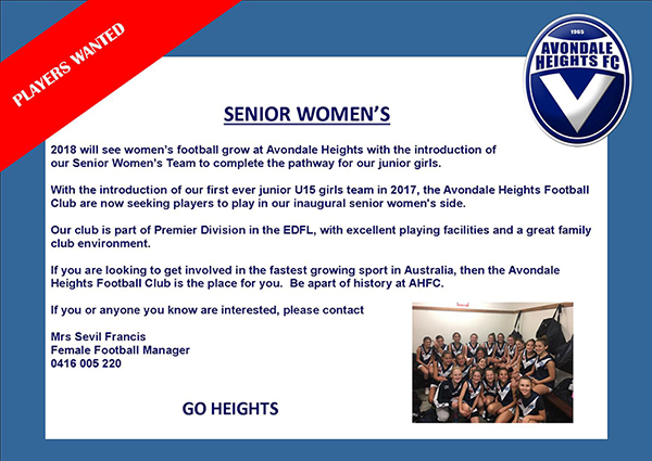 AHFC SENIOR WOMAN'S TEAM 2018 The Avondale Heights Football Club is seeking players for our inaugural women's football team.