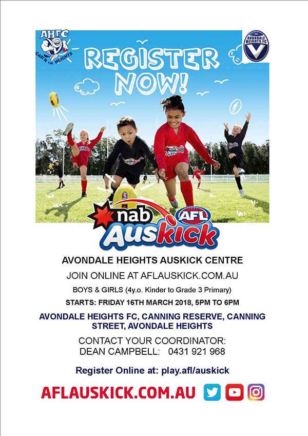 For those wanting join Under 9's at Avondale Heights Football Club, you can register at the club this Friday night from 5.00pm onwards.